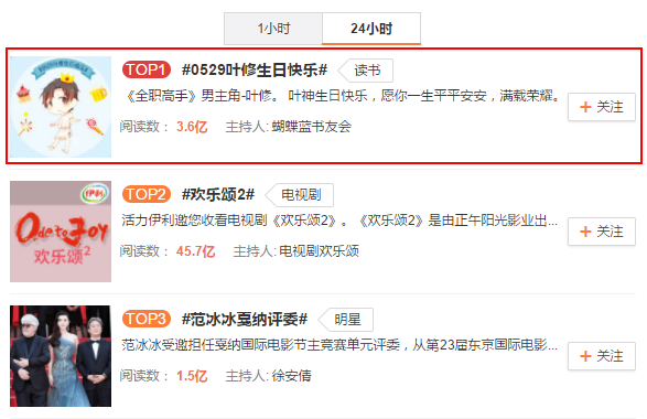 每年叶修的生日,新浪微博上名为“#0529叶修生日快乐#”的微博话题都会成为网络上热议的焦点,今年也不例外。新浪微博、百度贴吧里满满的留言和点赞,不到48小时,#0529叶修生日快乐#微博话题已获得3.6亿次微博阅读量、109.8万条话题讨论,全职粉丝们纷纷晒出了他们为叶修庆生的各种方式,有的为他制作明信片,有的为他画肖像,还有的为他录制祝福视频,充分证明了叶修的魅力。