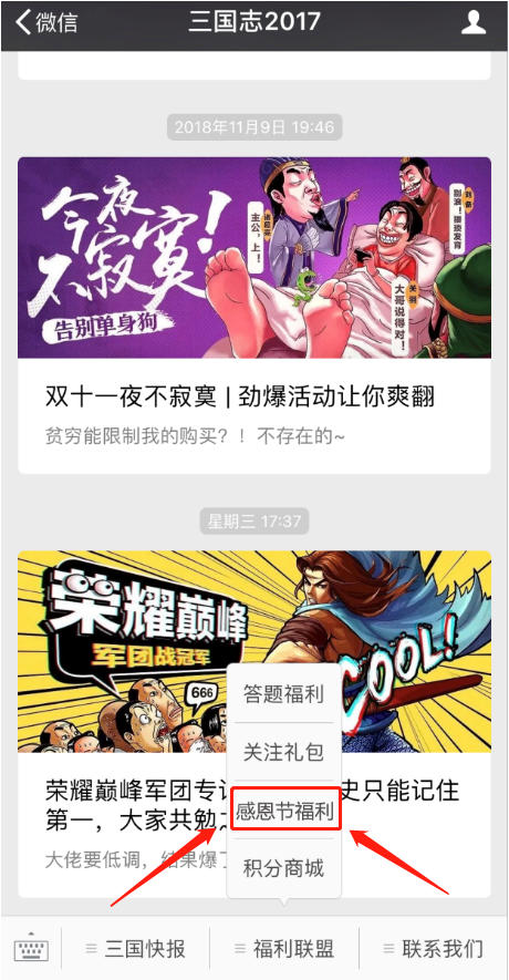 对于各位主公而言,每日签到赢积分绝对是老生常谈的一件事儿,而日常的那堆可兑换奖励也是见怪不怪了。恰逢感恩节,《三国志2017》福利再升级,10积分即可换取超大礼包!进入官方微信,滑动至页面下方“感恩节福利”,根据个人喜好选择不同档位的福利,内含高级资源箱、市场刷新令、5级弓兵武器、中级兵符等超多档福利道具,助你谋战三国!