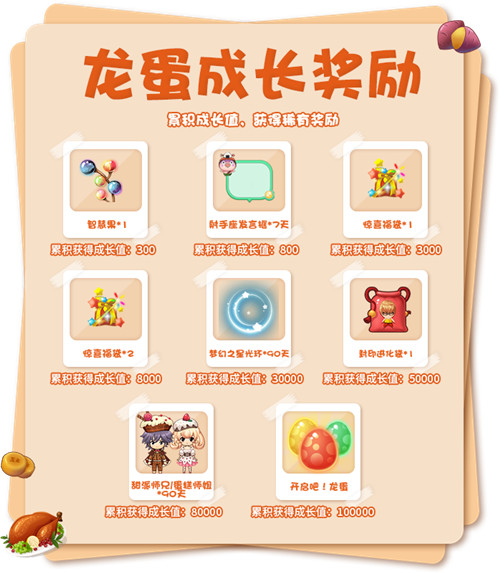 在活动界面,玩家可以看到属于自己的龙蛋的成长状况,每枚龙蛋达到一定成长值后,就可以领取对应奖励啦!当龙蛋完成成长之后就会破开,龙蛋的主人将会随机获得一只宠物,有大几率是封印宠物哦!当孵化一枚龙蛋后,可继续从三枚龙蛋中选择一颗重新成长。