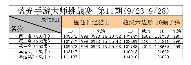 蓝光手游大师挑战赛 欢乐一夏 第11期获奖名单: