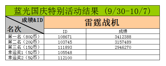国庆长假归来,大家是不是跟小编一样,头昏眼花,四肢无力,心情低落…祖国母亲能再过一次农历生日的愿望是如此的强烈,做为一个中国人……好啦,不闲扯了,经过国庆七天的激烈角逐,蓝光手游大师携手《雷霆战机》的国庆特别活动落下帷幕,现在公布成绩啦!!