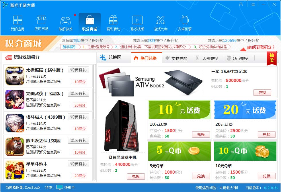 喜!上!加!喜!如果你在蓝光手游大师的积分商城里,抽中了奖品,或兑换了奖品,将喜悦分享出去,即可获得独家海量手游礼包
