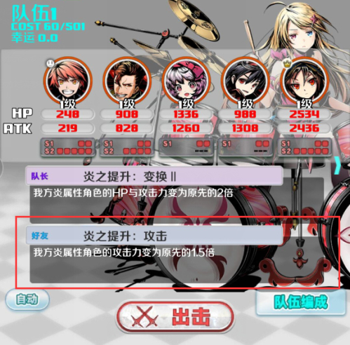 上图是指定条件进行属性提升的队长技,此类指定属性或种族进行属性提升的队长技为众多队长技中的一种。假设队伍中所有成员都满足上图中队长技所需条件(全员炎属性),所有成员的血量以及攻击力都将翻倍!对于攻坚来说,这无疑将是巨大的提升。选择完队长后,只需挑选满足队长技条件的合适成员,即可让全队享有加成效果!
