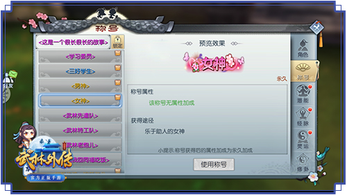 江湖有真情,武林侠士在!各位乐于助人的男神女神们,记得使用侠义值,到商城里兑换专属男神女神称号哦~