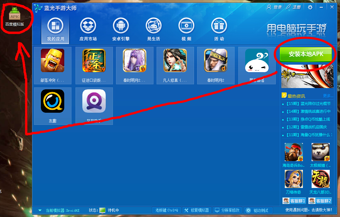 (3)打开蓝光手游大师,打开我的应用,点击右侧本地安装,选择刚下载的修改包。(如装了原版的玩家请先卸载)
