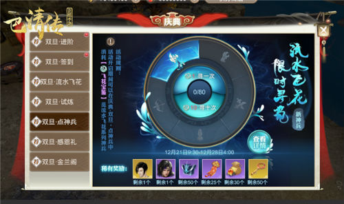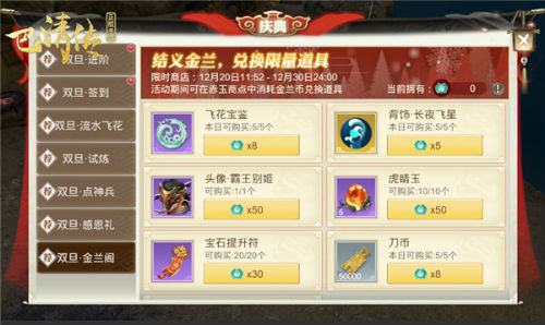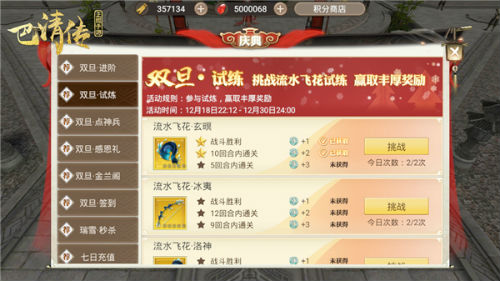 在双旦期间,各位主事大人可参与“流水飞花”主题试炼。挑战流水飞花系列武器试炼关卡,获胜可获金兰币。活动期间,根据挑战的关卡星级还将获得相应地飞花宝鉴奖励,星级越高奖励越多。