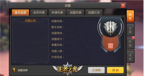 进入战盟界面,首先能看到自己所在战盟的基本信息,比如战盟等级、战盟总体战力以及战盟总资金等。界面左侧为战盟公告,由盟主拟定。另外,还可以查看本盟内所有成员额度信息和区服内其他战盟的信息。除了这些基本内容,我们还可以领取战盟内小伙伴的红包,同时自己也可以派红包,这算是对平民玩家很给力的福利了。