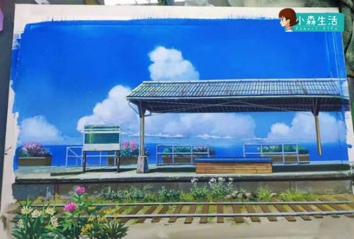 车站初稿,画师因为细节不够满意,并且之后在某个地方下错了笔,导致整张原画报废,最后只能重画,原画的最终成稿则是下面这张大家熟悉的小森车站。