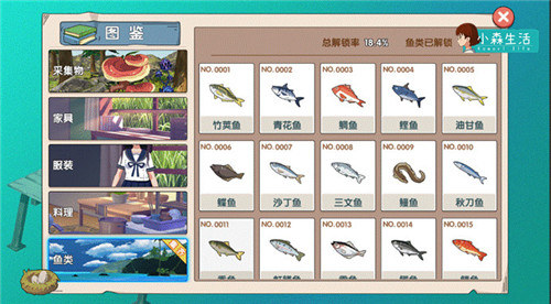 在小森原生态的河里,有着各种各样的鱼,竹荚鱼、青花鱼、鲷鱼、鲣鱼、油甘鱼、鲽鱼、沙丁鱼、三文鱼、鳗鱼、秋刀鱼、香鱼、虹鳟鱼、雷鱼、鲫鱼、鲤鱼……还有贝类、海螺,以及各种稀有鱼类。当钓到鱼时,可以选择“放生”或者“装入”,有些濒危的鱼种,不如直接放生吧!除了体验钓鱼的乐趣,丰富的水产品还可以做成鲜美的料理哦(你是魔鬼吗?)。