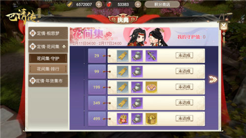 在“定情花间集”活动中,玩家送出情人节礼物(包括:定情玫瑰、红袖添香以及一抹花色)可获得守护值,并可参与守护排行榜,赢取守护排行奖励。若玩家守护值达到指定数值,还能额外领取丰厚奖励。