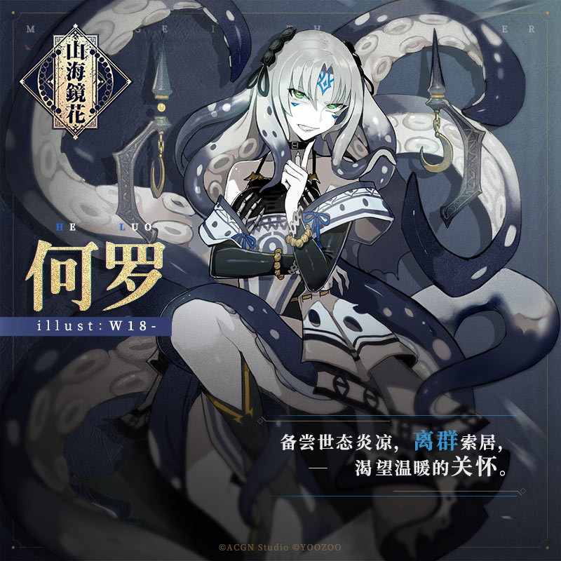 《山海镜花》中的何罗是生于谯水的鱼妖少女,而因为她带着暗色触手模样,自小就被谯水中的其他鱼类小伙伴们以及周围的居民们排斥。成长中的磨难让她的触手锻炼得格外强壮,颜色也愈发乌亮。她那双碧绿的眼眸依旧如深海中的明玉般分外纯洁透亮,但却不得不被用于透露凶光,威慑着所有人,给人的感觉相当难以接近。