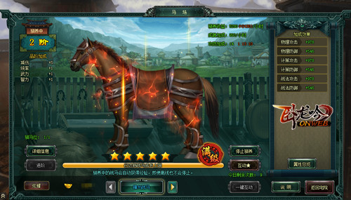 战马是主公不离不弃的伙伴,跟随主公一起成长。战马的星级相当于战马的等级,通过训练战马可以获得经验提升星级,星级越高战马的属性加成也就越高,增幅取决于战马的成长系数。当星星存满后可以进行进阶,每一次进阶可以大幅度提升战马的基础属性,提高成长系数,同时获得一定的等阶加成,如暴击、反伤、武力等加成属性,对所有武将都有用。