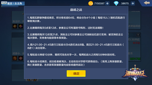 玩家们可以在每周一到五参与挑战赢取排名,主动挑战来自不同区服的玩家,战力越高积分越多,挑战次数与玩家的特权等级相关。最终排名在榜上前64名的玩家,才有自格参与最终的“巅峰之战”。