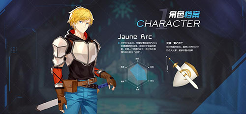 Jaune Arc是JNPR小队第一位出场的人物,在首次登场时因为在飞船上的强烈的晕机症表现而被 Ruby Rose和 Yang Xiao Long称为“呕吐男”。虽然Jaune Arc从未接受过正式的训练,战技与学识都并不出色,但是Jaune具有克敌制胜的强烈意愿。手持“黄色死亡”的他,保护的却是队友们生的希望,剑与鞘盾的组合,成为最出色的团队领导者,合最坚实的后盾。