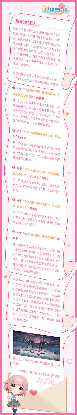 AKB48正版授权偶像养成手游《AKB48樱桃湾之夏》先锋测试日前完美落幕,官方也收到了数千条玩家的意见和反馈。今日,运营团队致谢各位“经纪人”,感谢大家对于先锋测试的支持,并对于大家集中关心的问题给予了答复,全文内容如下: