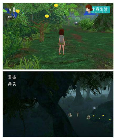 小森的野外是有昼夜变化的,每一小时进行切换,小地图上都会给予标识。当森林逐渐陷入黑暗,变得更加诡谲多变,细碎的星星铺在天幕,照亮夜行人的路,这便是小森的夜晚来临。萤火虫在枝蔓间翩飞,像是陨落的星辰,林间的水面倒映着星空,微风拂过,仿佛天幕被拨开。
